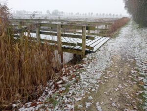Over ijsvogels; er is inmiddels een vaarverbod bij de aanlegsteiger van de haven van Witteveen. Niet omdat, na de eerste nachtvorst, de ijsvereniging hoopt op schaatsen. Nee voor schaatsen en de kantineomzet hebben we een prachtige eigen ijsbaan. Ons ijsvogeltje heeft namelijk de rust nodig. Het lijkt of ze aan de haven is gaan wonen.