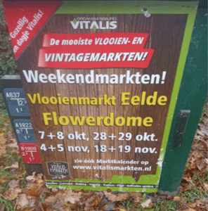 Grappig dat de ouwe markt in Eelde nog bestaat en, ook in ons dorp, met posters reclame maakt. We moeten allemaal naar de vintagemarkt in de flowerdome in Eelde. Prachtige naam, zo passend in deze tijd van holle reclame en het opgeklopte niets.